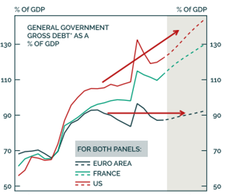 Zwar ist es um die Staatsfinanzen in den europäischen Ländern besser bestellt als in den USA. Selbst Frankreich, dem immer wieder eine zu hohe und zu schnell wachsende Verschuldung vorgeworfen wird, schneidet besser – beziehungsweise weniger schlecht – ab als die Vereinigten Staaten.