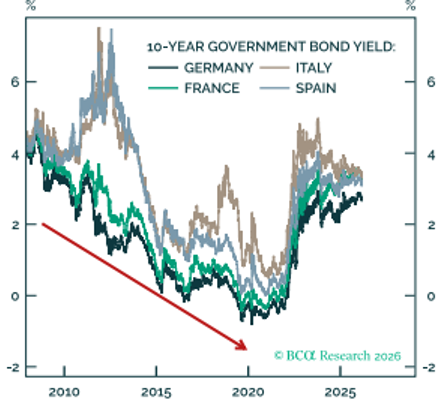 (Quelle: BCA Research, EIS, 05.03.2026, S. 2; Titel: Renditen zehnjähriger Staatsanleihen in der Euroregion)